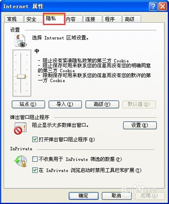 (5)在隐私对话框,可设置Cookie的安全级别,这里我们设置为阻止所有Cookie,点击应用,确定,这时即禁用了Cookie。
